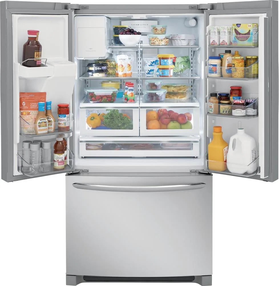 Frigidaire Gallery FGHB2868TF 26.8 Cu. Ft. French Door Refrigerator – Smudge-Proof Stainless Steel. Enjoy exceptional organization and freshness with this massive 26.8 cubic foot French door refrigerator. It features advanced CrispSeal crisper drawers that automatically block out dry air keeping your fruits and vegetables fresh for remarkably longer periods. The exterior water and ice dispenser utilizes the PureSource Ultra II filtration system to deliver pure great-tasting water while removing 99.3 percent of lead and other contaminants. The versatile full-width Cool-Zone drawer easily accommodates large party platters and sheet cakes making it perfect for entertaining. Coated in an exclusive Smudge-Proof stainless steel finish it actively resists fingerprints and wipes clean effortlessly.