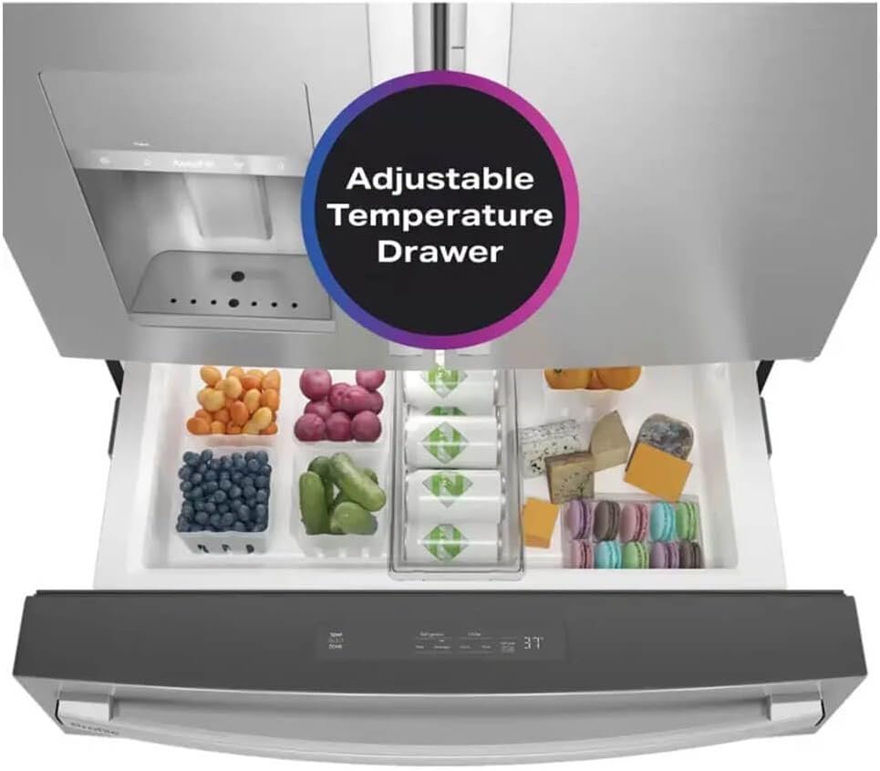 GE Profile PVD28BYNFS 27.7 Cu. Ft. 4-Door French Door Refrigerator – Stainless Steel. Enhance your kitchen with this incredibly spacious 27.7 cubic foot four-door French door refrigerator designed to keep all your family’s favorite foods organized and easily accessible. The innovative door-in-door design features a rotating bin and an AutoFill water pitcher that automatically replenishes with crisp filtered water ensuring you always have a cold drink ready. The full-width adjustable temperature drawer offers flexible storage with distinct temperature settings for deli meats beverages or wine. Inside the brilliant LED light wall completely illuminates the interior making it impossible for ingredients to hide in the back. With built-in Wi-Fi and a beautiful fingerprint-resistant exterior it effortlessly combines intelligent convenience with sleek premium aesthetics.