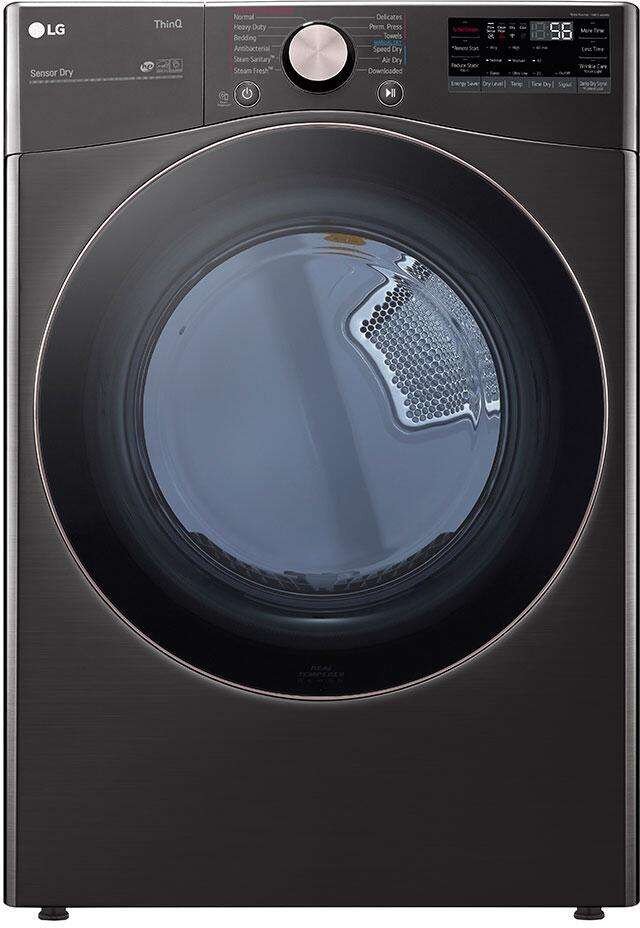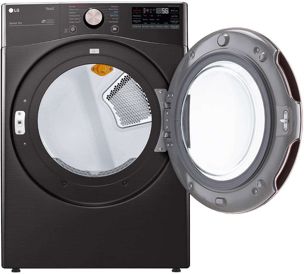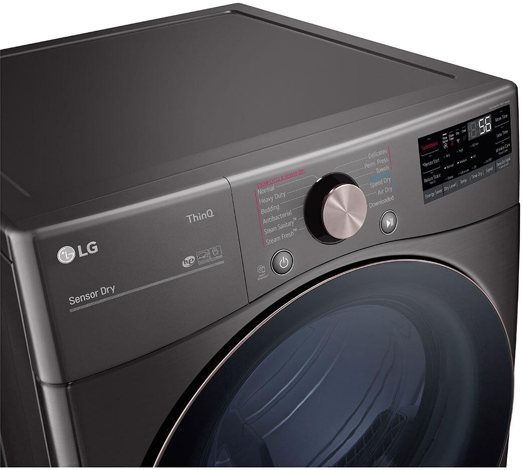 LG DLGX4001B 7.4 Cu. Ft. Smart Wi-Fi Enabled Front Load Gas Dryer – Black Steel. Care for your family’s garments with exceptional precision using this massive 7.4 cubic foot smart gas dryer finished in a gorgeous black steel. The built-in AI intelligence uses advanced sensors to select the optimal drying settings taking the guesswork out of laundry day. The powerful TurboSteam technology generates steam instantly to deeply penetrate fabrics reducing wrinkles and safely refreshing clothes in just 10 minutes so they are ready to wear immediately. The Sensor Dry system measures moisture levels continuously preventing over-drying and extending the lifespan of your wardrobe. Connect effortlessly to the ThinQ app to download customized drying cycles and monitor your machine remotely.