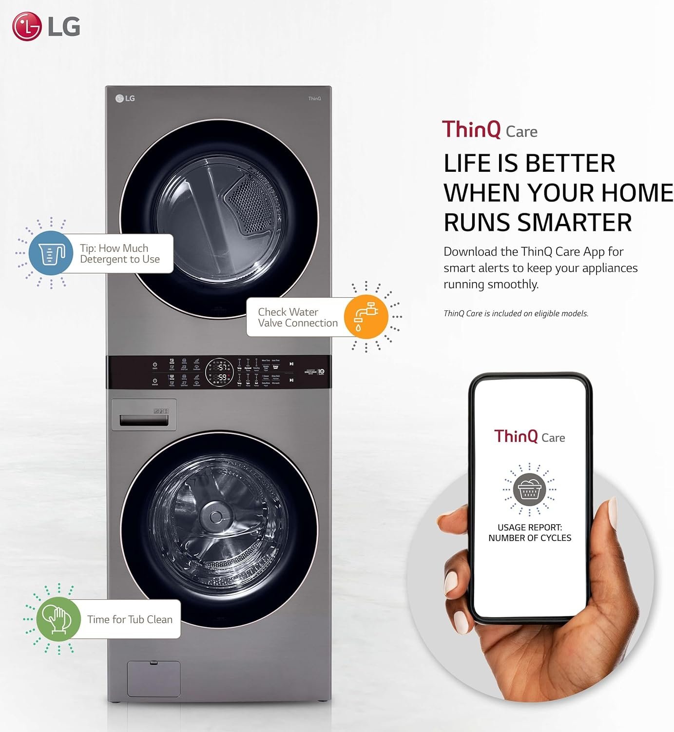 LG WashTower Smart Front Load Electric Laundry Center provides a revolutionary vertical design that occupies half the floor space of a traditional side-by-side set while delivering full-size capacity and advanced cleaning performance. This sale-priced laundry center features built-in intelligence that uses AI sensors to detect fabric texture and load size, automatically selecting the perfect wash and dry motions for better fabric care. The easy-to-reach Center Pod™ control panel operates both the washer and dryer from one central location, making it ideal for compact luxury condos in Doral and Miami. With TurboWash™ 360 technology, you can complete a full wash cycle in under 30 minutes, ensuring your household stays efficient and your clothes stay looking new.